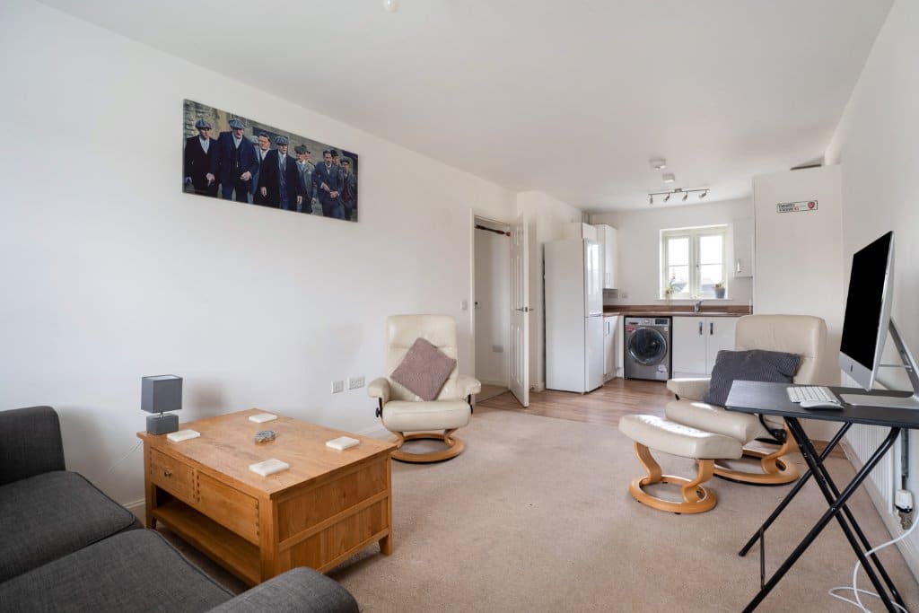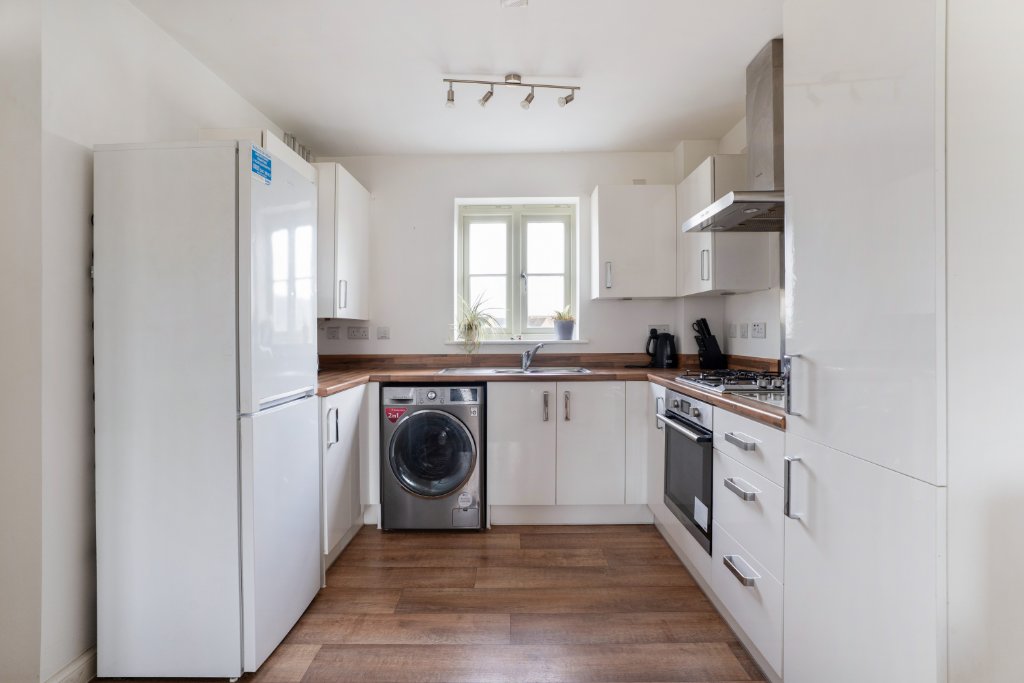 The kitchen has a range of floor and base units with wood laminate worktop and a stainless steel inset sink and drainer, an integrated Hotpoint single oven with four-ring gas hob with extraction hood over, space for a washing machine and fridge freezer, laminate flooring and an east facing window with views over the development