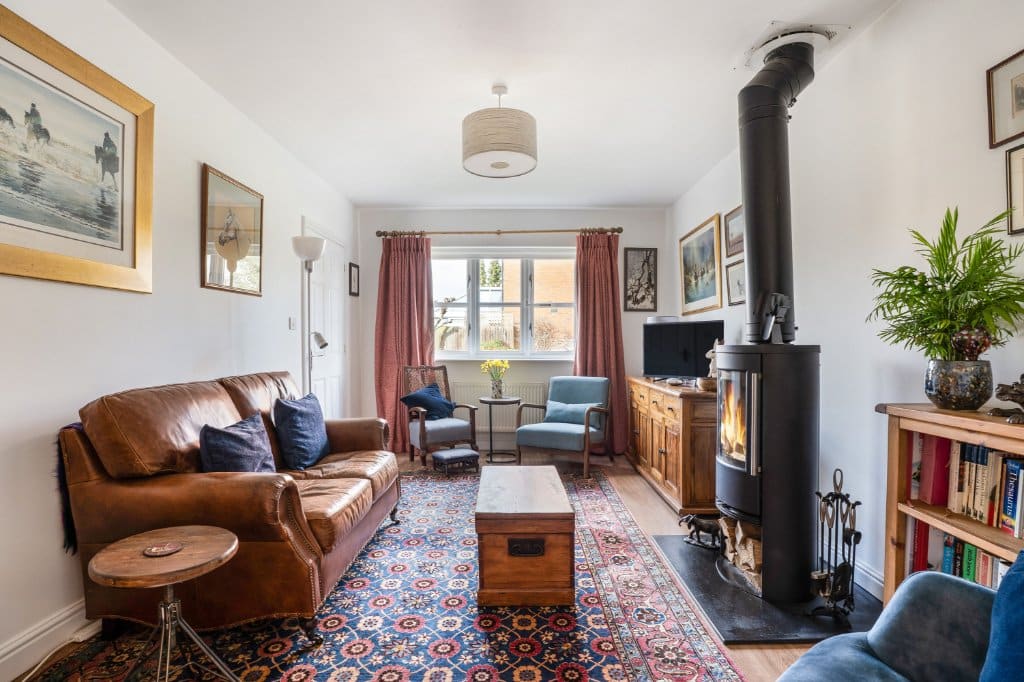 The spacious sitting room has a stylish contemporary wood burner, Karndean flooring, and double doors connecting to the dining room