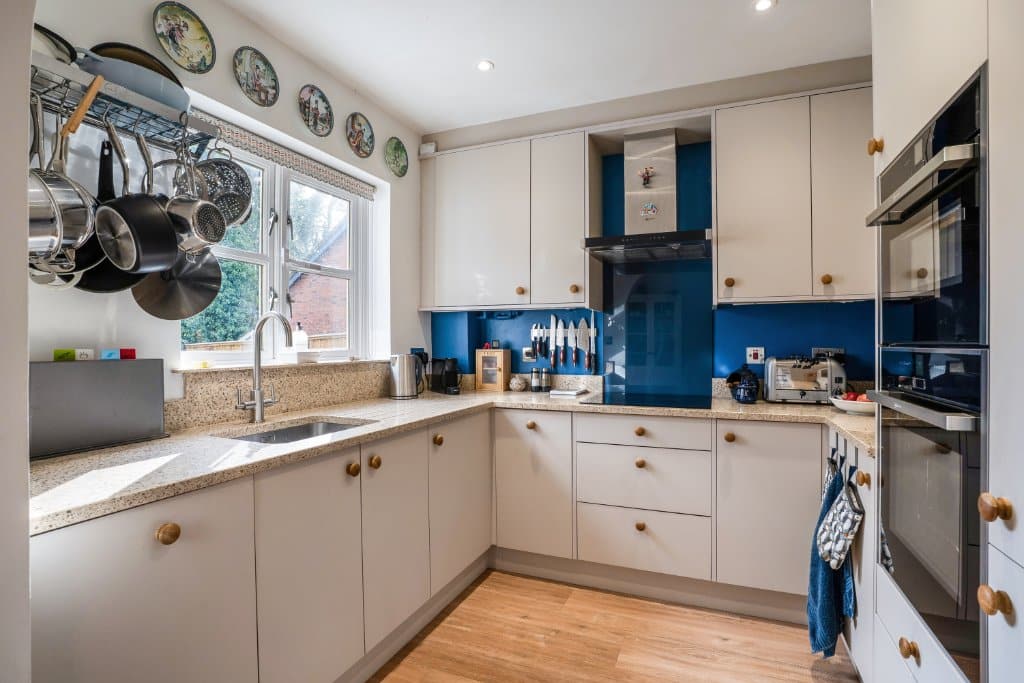 The entrance hall is particularly generous in size, with Karndean flooring, stairs rising to the first floor with cupboard underneath, and a refitted downstairs cloakroom with vanity wash-hand basin and low-level wc