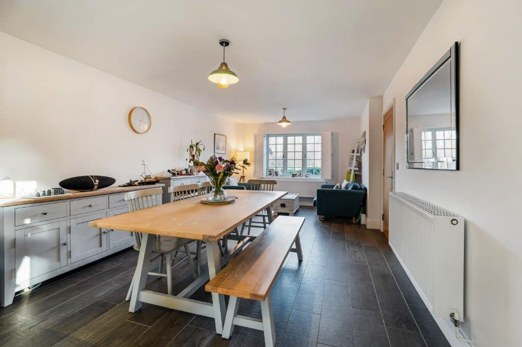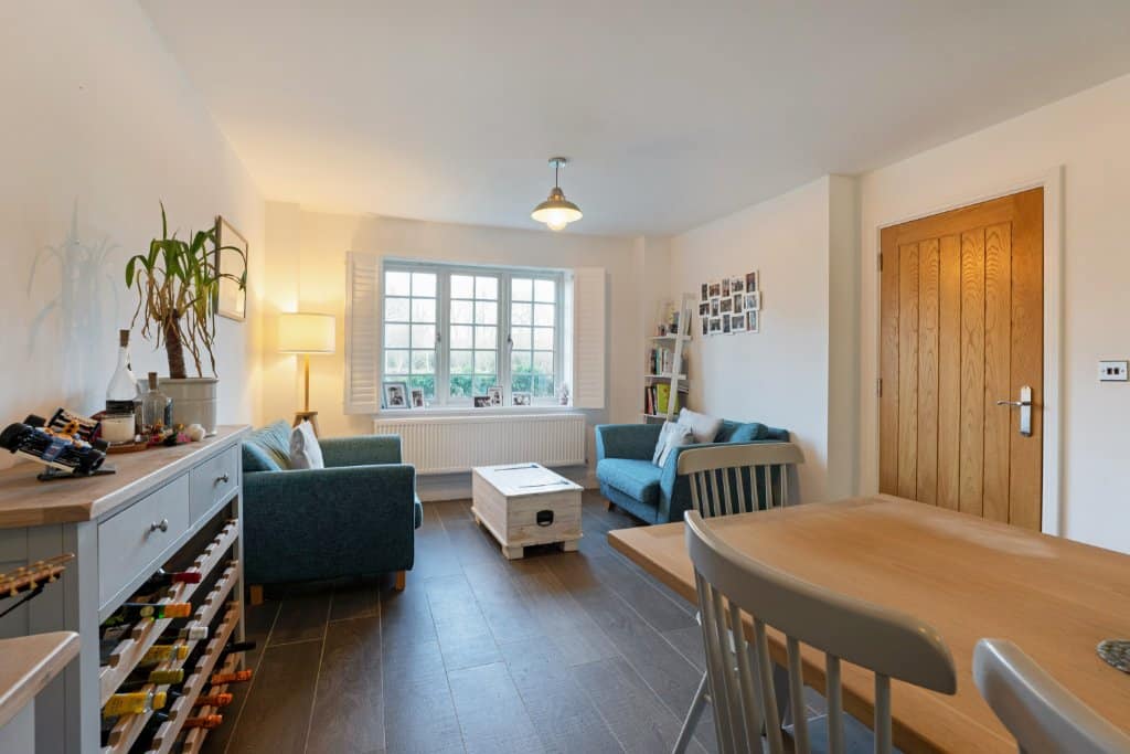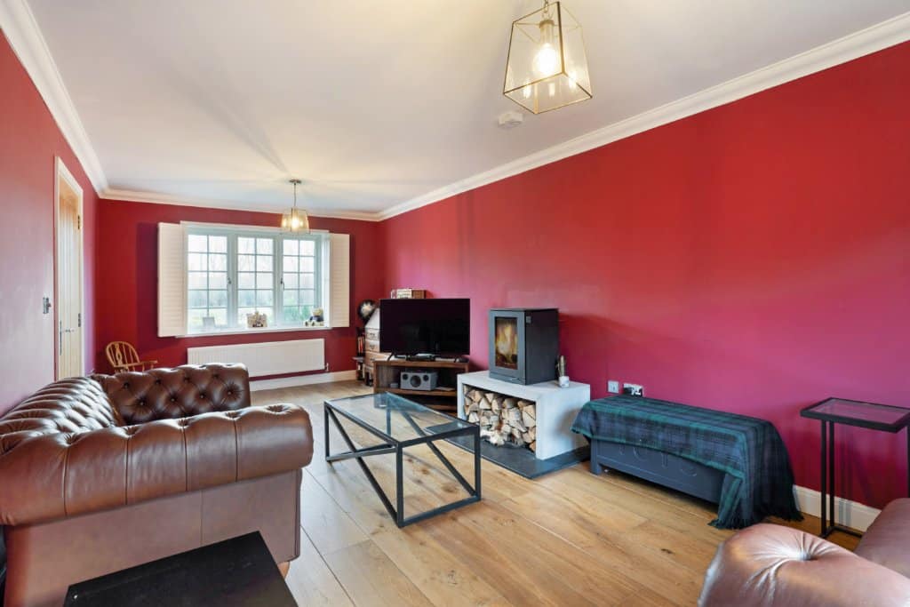 The dual aspect sitting room has a wood log burner, oak flooring, and double French doors that open to the terrace