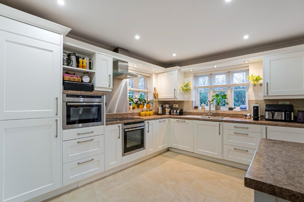 The contemporary kitchen/breakfast room has been modernised to a high standard, and has a good selection of wall and base cupboards, fitted with basket inserts for added storage, work surfaces, inset cream sink and several built-in appliances such as a Neff oven and eye-level microwave, AEG four-ring induction hob with a stainless-steel splashback and overhead extractor hood, and Smeg dishwasher