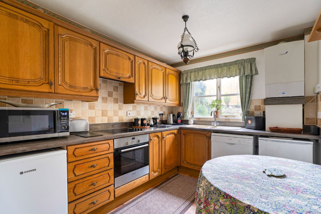 The fitted traditional kitchen, offers a good selection of oak-fronted wall and base units, integrated Bosch electric oven and Indesit halogen hob, space for dishwasher, space for low-level fridge and separate freezer, wall-mounted combination gas boiler and tiled-effect vinyl flooring